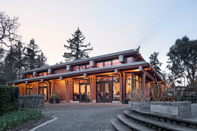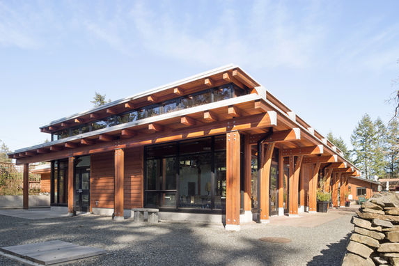 A legacy building, the Couvelier Pavilion is the cornerstone of the non-profit Horticulture Centre of the Pacific. Named after the Centre's original visionary, and former Saanich Mayor, Mel Couvelier, the structure replaces the former glass house and wedding pavilion that was lost to fire in February 2011. Working within a tight budget of the community raised contributions through a grassroots fundraising effort, the new pavilion offers a modern timber frame enclosure with catering facilities, state-of-the-art visual and conferencing technology, and seamless connectivity to the surrounding gardens.